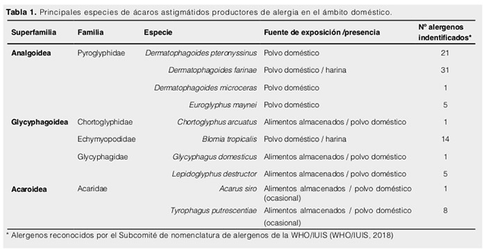 Los ácaros del orden Astigmata, cuyos alérgenos se dispersan principalmente a través de las partículas fecales, se consideran la principal fuente de alergia en ambientes interiores. Los ácaros domésticos se encuentran presentes en el polvo acumulado en colchones, alfombras, muebles, etc. en domicilios u otros espacios interiores y son capaces de provocar sensibilización e inducir reacciones alérgicas.