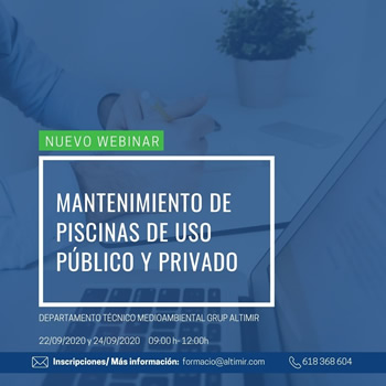 Altimir Grup organiza una nueva edición de la formación "Mantenimiento de piscinas de uso público y privado", en formato webinar, que tendran lugar los próximos días 22 y 24 de septiembre. Esta formación, dirigida al personal de mantenimiento, tiene por objetivo dar a conocer los riesgos asociados a las piscinas, las operaciones de mantenimiento y la normativa en vigor para cumplir con los criterios higiénicos-sanitarios aplicables a estas instalaciones.