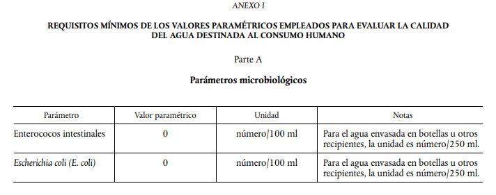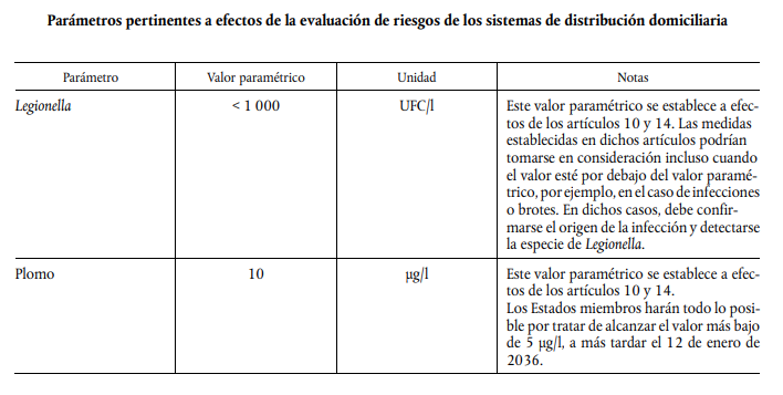 Fuente: DIRECTIVA (UE) 2020/2184 DEL PARLAMENTO EUROPEO Y DEL CONSEJO de 16 de diciembre de 2020 relativa a la calidad de las aguas destinadas al consumo humano (versión refundida)
