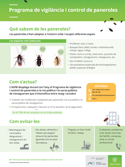La Agència de Salut Pública de Barcelona (ASPB) despliega durante todo el año un Programa de Vigilancia y Control de cucarachas en la via pública y la red de alcantarillado de la ciudad para mantenerlas bajo control. Este programa se intensifica entre mayo y octubre, coincidiendo con el período de mayor actividad de estos insectos.