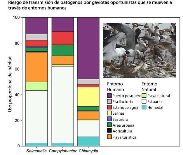 Las áreas de riesgo de propagación de los patógenos registradas se superpone con hábitats relacionados con los humanos, como estanques de agua, puertos pesqueros o playas turísticas, lo que aumenta el riesgo de transmisión directa e indirecta de enfermedades entre humanos y aves recíprocamente.
