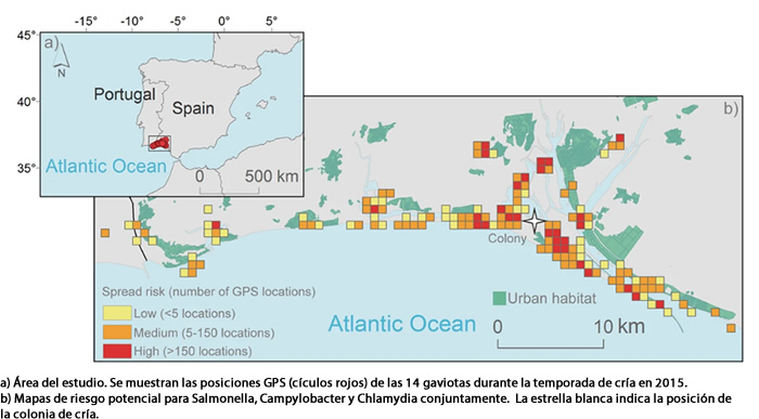 Las más de 27.000 localizaciones registradas por GPS revelaron el mayor riesgo de diseminación bacteriana en un radio de 5 km alrededor de la colonia de cría, sin observarse diferencias significativas entre los tipos de hábitat utilizados por las aves infectadas por Salmonella, Campylobacter o Chlamydia.