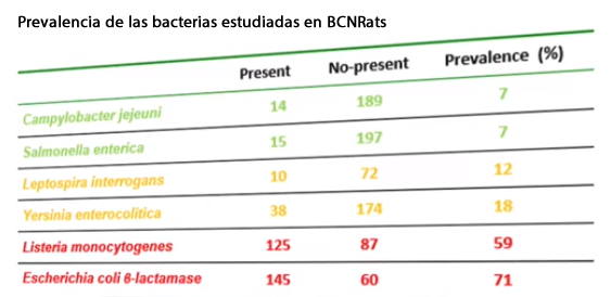 El estudio se centró en seis bacterias patógenas: Campylobacter jejuni, Salmonella enterica, Leptospira interrogans, Yersinia enterocolítica, Listeria monocytogenes y Escherichia coli. Estas dos últimas mostraron una prevalencia muy alta (>50%), que además se mantuvo durante todo el año, mientras que los otros cuatro patógenos tuvieron una prevalencia menor y puntual según la época del año. Este hecho parece responder a que el estudio se ha realizado en un entorno no natural, dentro de un contexto muy influido por la presencia humana. Los ciudadanos aportamos al habitat de las ratas en el alcantarillado nuestra materia orgánica, y con ella un nivel alto de contaminación con patógenos como la Listeria.