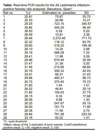 El estudio de Leishmania infantum se realizó sobre órganos de 98 ejemplares de Rattus norvegicus capturados en parques (14) y alcantarillado (84) de Barcelona, mediante qPCR para la detección de ADN del parásito. De las capturadas en parques solo una dio positivo mientras que las ratas del alcantarillado mostraron una prevalencia del parásito del 33%.