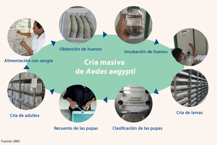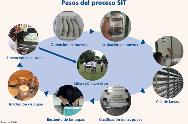 Un método prometedor para el control de las poblaciones de mosquitos Aedes, principales vectores de arbovirus entre humanos, es la cria y liberación masiva de machos previamente esterilizados. Sin embargo, antes de decidir poner en práctica un programa de esterilización de insectos SIT (sterile insect technique ) hay que analizar su viabilidad y el conjunto completo de sus componentes. La OMS ha publicado una guia práctica sobre planificación e implementación de un programa SIT.