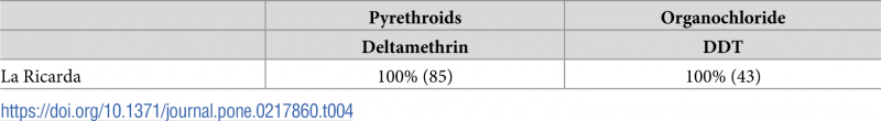 El nivel de resistencia al insecticida probado se estableció siguiendo las directrices actuales de la OMS; las poblaciones de mosquitos se clasificaron como susceptibles si la mortalidad variaba del 98 al 100%, 24 horas después de la exposición al insecticida. Una mortalidad de entre 90 y 97% se definió como un indicio de resistencia pero se consideraron necesarias más pruebas de seguimiento para confirmarla. En el caso de que la mortalidad fuera inferior al 90% , se confirmó la resistencia, no siendo necesarios más ensayos adicionales en el caso de las pruebas se hayan realizado con, al menos, 100 mosquitos.