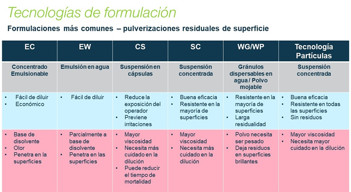 - El segundo grupo lo forman las Suspensiones de Cápsulas (CS) y los Concentrados de Suspensión (SC). Son un poco más modernos, aunque también están presentes en el mercado hace un tiempo. Generalmente proporcionan una muy buena eficacia general y son muy sólidos en la mayoría de las superficies. El inconveniente en estos casos es que deben ser muy viscosos porque contienen partículas que se pueden sedimentar en el envase, por lo que deben tener una alta viscosidad y por este motivo es necesario agitarlos antes de la dilución.