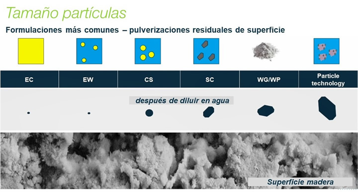 Los productos a base de disolvente formarán un principio activo en forma de emulsión, en gotas muy pequeñas. En todos los otros tipos de productos las partículas que contienen el ingrediente activo flotarán libremente en la dilución. Sin embargo, su tamaño puede ser muy diferente, generalmente a partir de 1 a 2 micras. En cambio, las partículas del producto desarrollado en base a la tecnología de partículas son de alrededor de 10 micras.