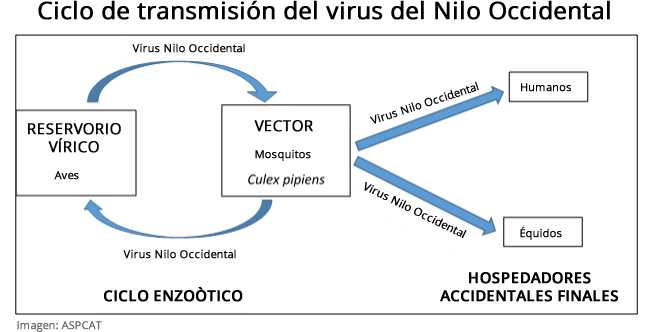 La fiebre del Nilo Occidental (VNO) es una zoonosis con un ciclo biológico complejo, que implica un hospedador vertebrado como reservorio primario (aves) y un vector (mosquito), que se amplifica a través de la transmisión constante entre el mosquito vector y las aves. Se han identificado numerosas especies de mosquitos capaces de actuar como vectores del VNO, principalmente del género Culex, algunas de las cuales, como nuestro mosquito común autóctono Culex pipiens, se encuentran ampliamente distribuidas en Cataluña.