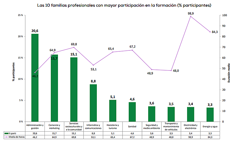 Las 10 familias profesionales con mayor participación en la formación (% participantes) fueron las siguientes: