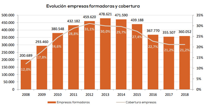 Sin embargo, la tasa de cobertura de las empresas formadoras, es decir el porcentaje de empresas que realizaron formación para sus trabajadores respecto al total de empresas que cotizaron por Formación Profesional en la Tesorería General de la Seguridad Social, no se vió mejorada y tan sólo un 21,2% de estas empresas aprovecharon su crédito de formación.