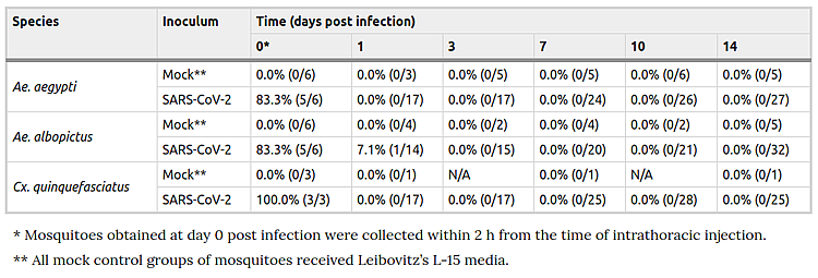 Tras realizar la inoculación intratorácica con SARS-CoV-2 en mosquitos de las tres especies estudiadas, se observó la capacidad del virus para infectar y replicarse en los insectos. La hipótesis de los autores fue que si el virus no se replicaba en estas condiciones, entonces incluso si los mosquitos se llegaran a alimentar de personas virémicas y el virus fuera capaz de diseminarse desde el intestino medio del insecto, la falta de replicación impediria la posibilidad de transmisión biológica.