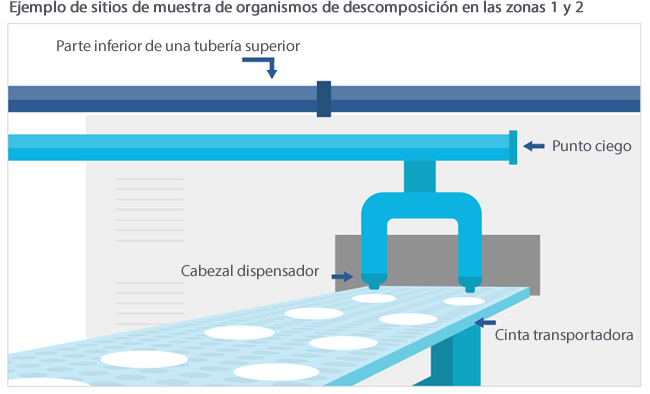 Una opción para organizar la monitorización ambiental de estos organismos es estructurar la actividad de muestreo por zonas, en las que se incluyen superficies propensas a albergar organismos problemáticos cada vez más distantes de la producción de los alimentos, y que pueden contribuir a la contaminación cruzada.