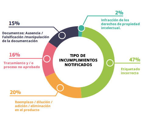 La mayoría de las solicitudes en el sistema indican más de un tipo de incumplimiento notificado por solicitud. Por ejemplo, diluir intencionalmente el producto con agua también es un problema de etiquetado incorrecto (ya que la composición, cantidad o peso en la etiqueta no reflejaría el producto real).. El incumplimiento más común fue el "etiquetado incorrecto", que representó el 47,3% del total de las violaciones denunciadas en el sistema.