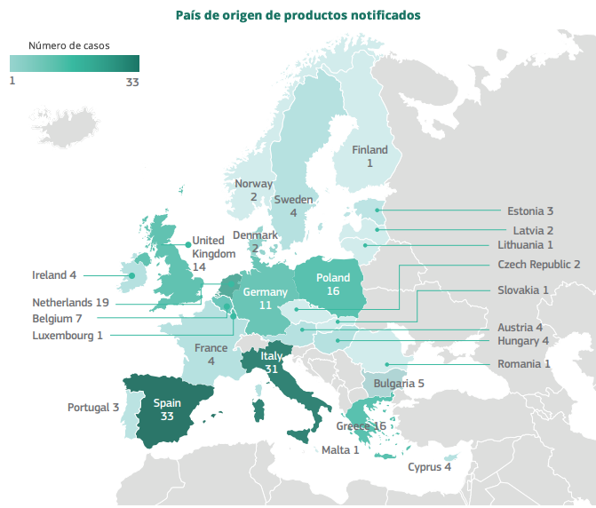 Por último, los países de origen, en la UE, de productos notificados en el sistema como sospechosos de fraude fueron: