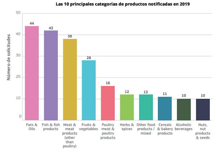 En 2019, se observan cambios en las 10 principales categorías de productos notificados respecto al año anterior. El grupo "grasas y aceites" pasó de la tercera posición en 2018, después de "pescado" y "productos cárnicos", a la primera en 2019, siendo el aceite de oliva el producto más notificado en el sistema.