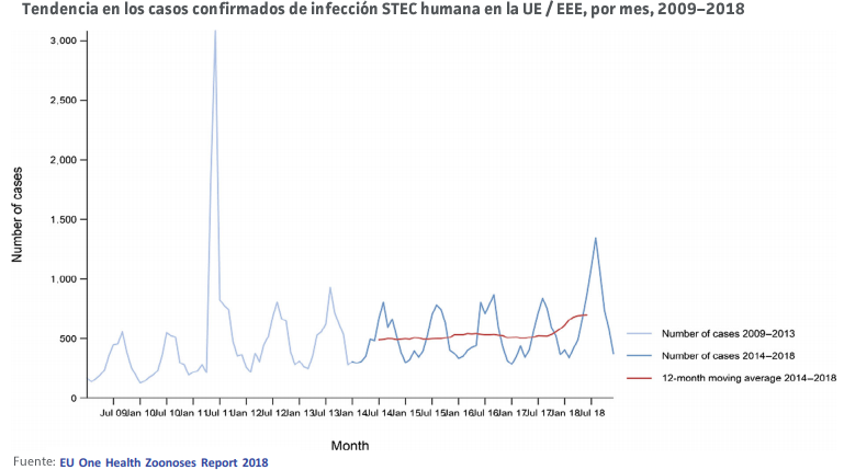 STEC se convirtió en 2018 en la tercera causa más común de zoonosis transmitida por los alimentos, con 8.161 casos notificados, tomando el lugar de la yersiniosis. Este hecho puede explicarse, en parte, por el uso creciente de nuevas tecnologías de laboratorio, que facilitan la detección de casos esporádicos.