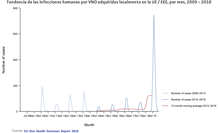 El informe One Health 2018 Zoonoses Report publicado por EFSA y ECDC recoge datos sobre la incidencia de las ocho principales zoonosis de monitoreo anual obligatorio (Campylobacter, Salmonella, Listeria, E. coli productora de toxina Shiga, tuberculosis por Mycobacterium bovis, Brucella, Trichinella y Echinococcus), así como de otras enfermedades menos comunes y emergentes, que se controlan según la frecuencia con la que ocurren, como es el caso de la fiebre del Virus del Nilo Occidental (VNO).