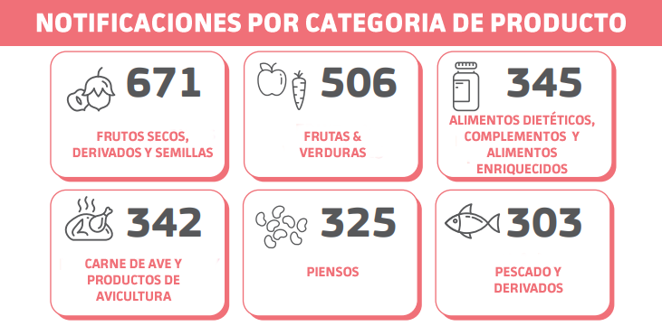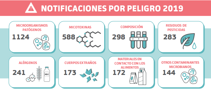 En los productos con origen en la UE, el peligro más notificado notificado fueron microorganismos patógenos en alimentos de origen animal, especialmente Salmonella en carne de ave, Listeria monocytogenes productos de pescado ahumados en frío y en carnes listas para el consumo, Escherichia coli productora de toxina shiga en en productos cárnicos (no tratados térmicamente) y quesos, asi como los norovirus. En alimentos producidos fuera de la UE, la mayoría de notificaciones relacionadas con microorganismos patógenos fueron por Salmonella, principalmente en semillas de sésamo, y también en hierbas y especias.Se registró un aumento del 17% en este tipo de notificación respecto a 2018.