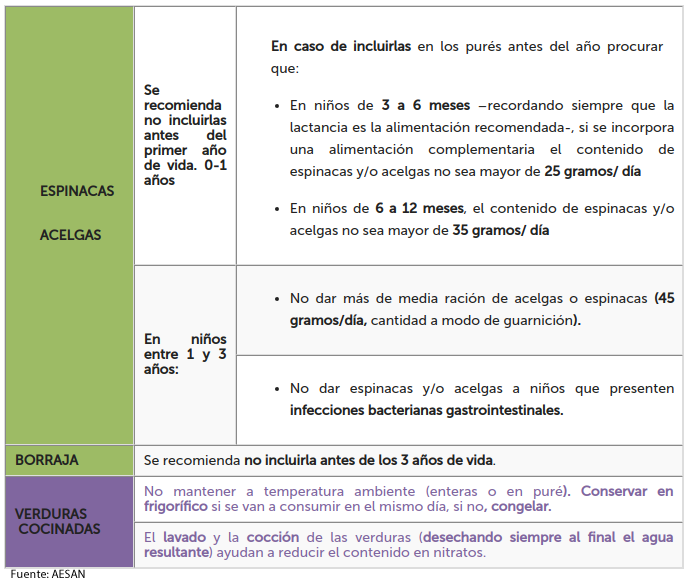 La AESAN ha actualizado sus recomendaciones de consumo de espinacas, acelgas y borrajas, alimentos ricos en nitratos, con el objetivo de disminuir la exposición a estos contaminantes en las poblaciones vulnerables: bebés y niños de corta edad. El riesgo de los nitratos viene dado por su transformación en nitritos en los procesos fisiológicos del cuerpo humano, que en altas concentraciones pueden originar metahemoglobinemia.