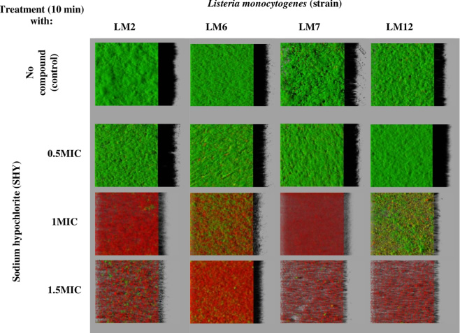 El hipoclorito de sodio en concentraciones de 1o 1.5MIC redujo la viabilidad celular en más del 90% en comparación con biofilms no tratados, lo que suguiere que el modo de acción de este biocida sobre la Listeria está principalmente relacionado con el daño en la integridad de la menbrana celular.