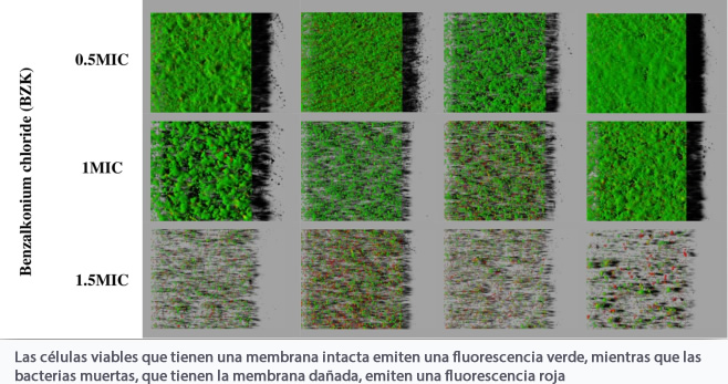 Los antimicrobianos aplicados a 0.5MIC redujeron el biovolumen de las biopelículas, mientras que a 1MIC o 1.5MIC (especialmente el cloruro de benzalconio a 1.5MIC) redujeron sustancialmente el biovolumen, la cobertura de la superficie y el espesor máximo de las biopelículas.
