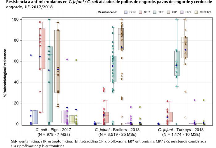 A nivel general, los datos obtenidos de Campylobacter jejuni y C. coli de origen humano y animal en 2017-2018, mostraron niveles de resistencia de muy altos a extremadamente altos a las fluoroquinolonas, que son antibióticos de importancia crítica (CIA) para el tratamiento de infecciones por Campylobacter en humanos. Se observó una tendencia creciente en la resistencia en varios países tanto en humanos como en animales.