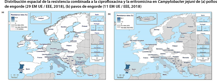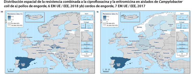 En los aislamientos de Campylobacter de muestras de carne de pollos de engorde y pavos , la resistencia generalmente se observó a niveles más altos en C. coli que en C. jejuni. Los niveles más altos de resistencia se observaron para la ciprofloxacina, el ácido nalidíxico y la tetraciclina (porcentajes generales: 54-83%) teniendo en cuenta todos los MS que aportaron datos. En general, la mayoría de los EM informaron niveles de resistencia de altos a extremadamente altos a estos antimicrobianos.