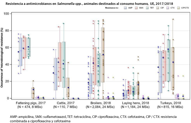 Fuente: The European Union Summary Report on Antimicrobial Resistance in zoonotic and indicator bacteria from humans, animals and food in 2017/2018, EFSA/ECDC