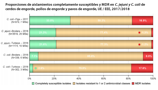 Los niveles de resistencia combinada (MDR) entre los aislados de Campylobacter recuperados de animales destinados al consumo humano se muestran a continuación.. En general, se observó un nivel moderado de MDR en aislamientos de C. coli recuperados de cerdos de engorde (16.8%), y en niveles más bajos en aislamientos de C. coli recuperados de pollos de engorde (8.0%) y de C. jejuni recuperados de terneros (4.1%), pollos de engorde (1.2%) y pavos de engorde (1,2%).