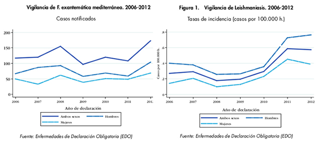 La Fiebre exantemática mediterránea, producida por la picadura de garrapatas, es una enfermedad considerada endémica de ámbito regional por lo que sólo la declaran 5 CCAA. En 2012 se produjo un aumento de los casos declarados. En España el período de actividad de la garrapata (vector de la enfermedad) puede cubrir todo el año.