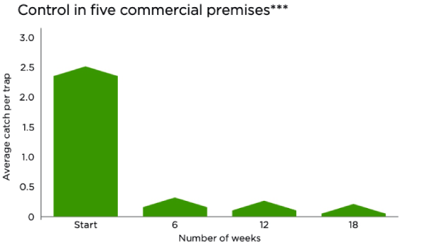 Además, como vemos en las figuras 2 y 3, el Advion® Gel Cucarachas mostró una reducción media del 99 % en la población de Pececillos de plata de cola larga en estudios de campo dentro de las 12 primeras semanas en 5 establecimientos comerciales y de más del 90% en solo 4 semanas después de la aplicación en 3 bibliotecas públicas, según estudios realizados por el Instituto Noruego de Salud Pública.