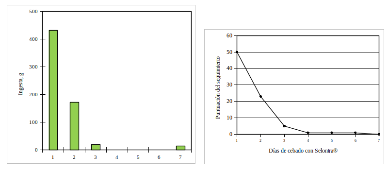Selontra ® hace que los roedores pierdan el apetito al día siguiente de consumir la dosis letal, por lo que no volverán a ingerir más cebo. Dado que Selontra ® es sumamente apetecible y atractivo para los roedores, deben seguirse los 5 pasos anteriores para permitir que toda la población de la plaga (los tres niveles jerárquicos) consuma la dosis letal de cebo tan rápido como sea posible. Si no hay suficiente cebo, algunos roedores dejarán de ingerirlo antes de llegar a consumir la dosis letal y, como resultado, no se llegará a controlar la plaga, derivando incluso en una aversión al cebo.
