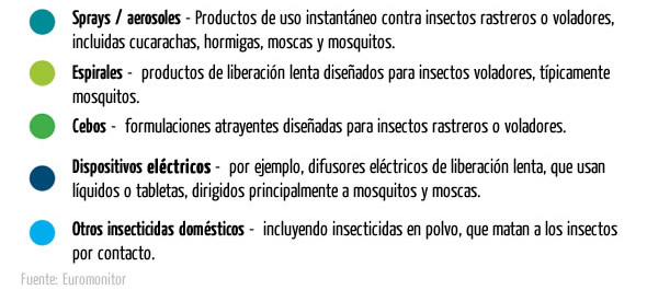 En 2018 el total de ventas de este sector se estimó en 903 millones de euros en la UE/EEE, siendo los productos más consumidos los sprays o aerosoles de uso inmediato contra insectos rastreros o voladores, seguidos de dispositivos eléctricos contra moscas y mosquitos, las formulaciones en forma de cebo contra insectos rastreros y voladores, y las espirales de liberación lenta, principalmente para mosquitos.